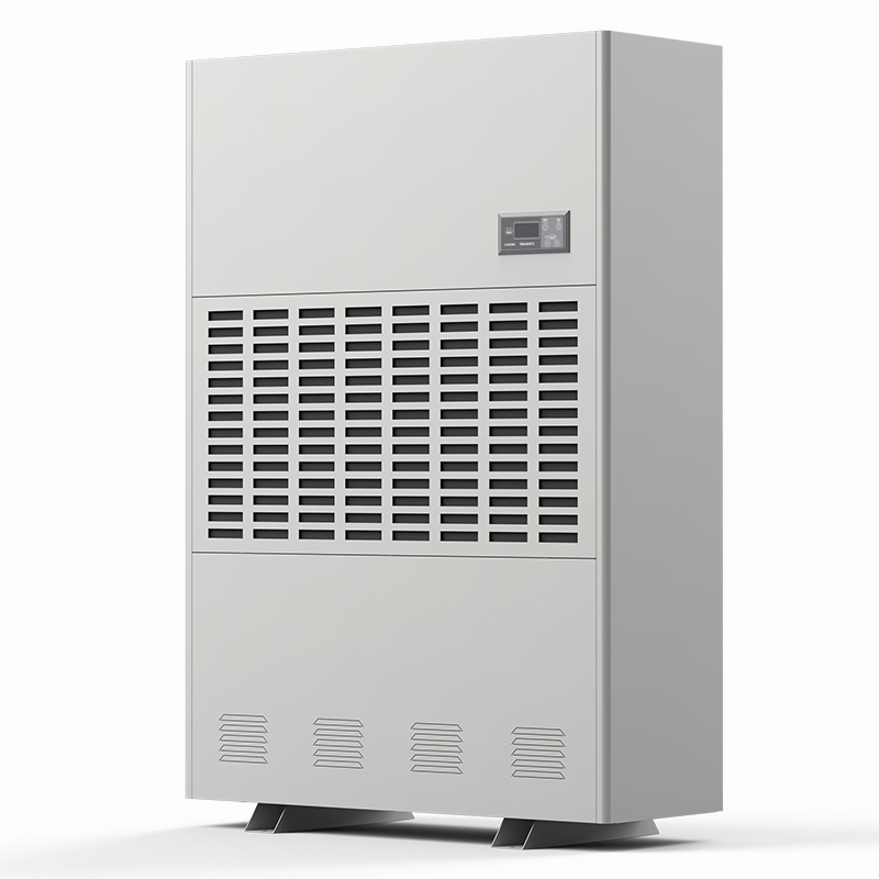 工业用除湿机通过风机将潮湿空气抽入机器内部,通过压缩机制冷将蒸发器降温至露点以下,潮湿空气经过蒸发器在表面凝结成水,汇集至接水盘后,流入水箱中,干爽空气经冷凝器重新加热由出风口排出,这样不断循环将室内湿度降低
