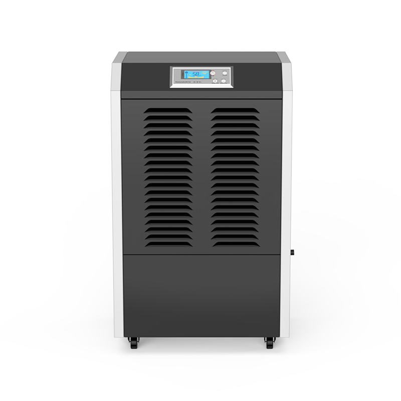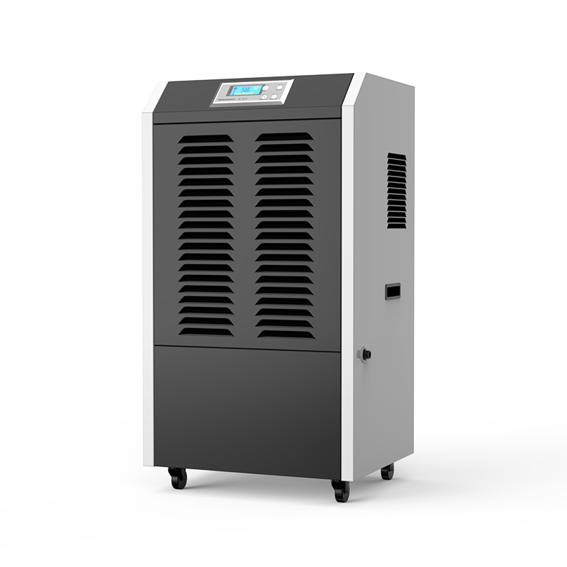 工业用除湿机通过风机将潮湿空气抽入机器内部,通过压缩机制冷将蒸发器降温至露点以下,潮湿空气经过蒸发器在表面凝结成水,汇集至接水盘后,流入水箱中,干爽空气经冷凝器重新加热由出风口排出,这样不断循环将室内湿度降低